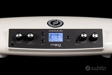 Il Moog Theremini è un sintetizzatore pronipote dello storico strumento elettronico russo al quale sono state aggiunte interessanti features che lo rendono perfetto per le performance dal vivo e in studio: impostazione della scala con auto correzione delle note, accordatore con visual track, 32 preset integrat con effetti, speaker interno, connessione USB, uscita pitch CV, antenna rimovibile Dimensioni e peso: 58 X 16 X 10 cm, peso 1,4 KG Condizioni estetiche: Ottime Funzionalità: perfetta Accessori: alimentatore, antenna