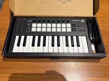 TASTIERA CONTROLLER MIDI 25 TASTI MINI. Novation ha progettato Launchkey Mini per rendere facile e divertente produrre musica in Ableton Live. Tutti i controlli funzionano non appena la si collega e sono disposti nel layout che pensiamo funzioni meglio. Mette16 pad lungo la parte superiore, che puoi usare per lanciare clip e suonare ritmi. Si illuminano per mostrarti quando vengono caricate, riprodotte e registrate le clip disposte in modo da adattarsi alla vista della sessione Ableton Live.