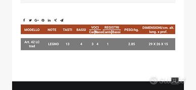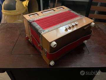 Fisarmonica diatonica Dino Baffetti, ottimo stato, come nuovo. Comprato da mio padre e custodito con cura. Caratteristiche nell’ultima foto, prese dal sito ufficiale del costruttore. Prezzo trattabile dopo visione.