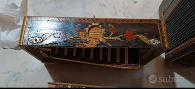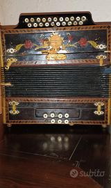 L’oggetto nelle immagini è una fisarmonica antica a bottoni, più precisamente un organetto diatonico (noto anche come fisarmonica diatonica o "organetto" in alcune regioni italiane). Questo tipo di strumento era molto diffuso in Europa nel XIX e XX secolo, specialmente in ambito folk e tradizionale.