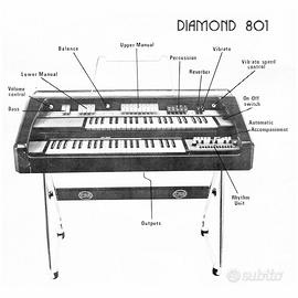 Organo elettrico vintage, a doppia tastiera, «Diamond 801» della Crb Elettronica di Ancona. Pedale. Sostegni in metallo smontabili. Con doppia custodia originale in pelle. Libretto di istruzioni. Probabilmente da sistemare i comandi elettronici nei selettori sulla destra.