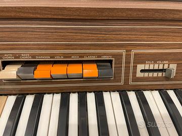 Strumento con mobile in legno, 49 tasti, selettori per diversi suoni (diapason, violino, clarinetto, reed, vibrato) e accompagnamenti automatici con accordi e ritmi regolabili.