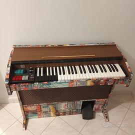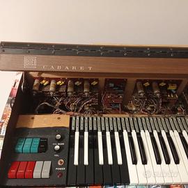 Anni '60, revisionato nell'impianto elettrico, con cambio spina, pulizia contatti. Uscite jack per collegamenti a scheda audio e cuffie; sezione bassi, effetti e volume indipendenti. Ha bisogno di scaldarsi per avere meno fruscio di sottofondo. Il pedale è rotto ma staccato per essere sostituito; dato il costo, avendo la stessa funzione sui tasti, ho preferito non sostituirlo. È stato rivestito con nuova carta vinilica per legno, più moderna. Invio samples audio a chi interessato. Ritiro a carico acquirente. Marca italiana, Cabaret.