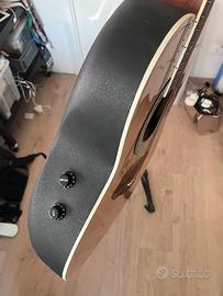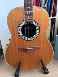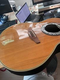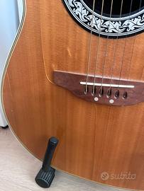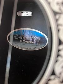 Celebrity by Ovation CC67 – Elettroacustica vintage Made in Korea · Kaman Music · S/N 177154 Chitarra elettroacustica roundback in buone condizioni funzionali. Specifiche: • Corpo deep bowl in Lyrachord • Tavola in Sitka Spruce laminato • Tastiera in rosewood con binding avorio • Ponte in walnut • Pickup piezoelettrico passivo con controlli volume e tono integrati • Jack uscita 1/4” • Meccaniche cromate chiuse • Scala 25¼” Condizioni: suona e si intona correttamente. Presenta CREPE superficialI della vernice trasparente; difetto puramente estetico, il legno è integro e si potrebbe riverniciare.
