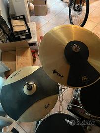 La batteria viene venduta con il seggiolino, tutto il kit Evans Soundoff che si può vedere dalle foto in caso non si voglia far rumore, il kit per i crash e ride della Meinl sempre per il rumore, due pad per esercitazione Evans RealFeel, due chiavette per accordare la batteria, la borsa porta bacchette Pearl, un'asta in più di un vecchio crash sempre del kit originale e un leggio di quelli grandi in ferro robusti color nero.