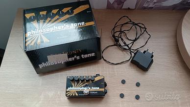 The Pigtronix Philosopher's Tone is a state-of-the-art analog compressor / sustainer, providing endless clean sustain. With variable Sustain (threshold), Blend (ratio) and Treble controls, the Philosopher's Tone offers a huge range of compression sounds for the discerning musician. The Philosophe's Tone also contains a smooth diode clipping distortion with a blend control for clean or dirty compression sounds and any mixture of the two. While the Philosopher's Tone distortion rocks on its own, it is designed to play well with other dirt pedals in order to create your ultimate distortion tone that sustains forever. [...] Practitioners of the mystical and ancient art of alchemy long sought an element called the Philosopher's Stone, believing that, if found, it could turn lead into gold and bestow immortality upon the man who wielded it. For such a tiny pedal to create so much sustain, we feel that this device represents a musical equivalent to this mythical substance in the world of guitar pedals."
