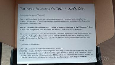 Vendesi raro pedale compressore per chitarra Pigtronix CSD Philosoper's Tone Compressor / Sustainer (versione Rev 1.1), ben conservato e provvisto di accessori (alimentatore da 18V e piedini), manuale e scatola originali.