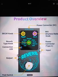 Pedale Riverbero digitale 9 effetti (Hall+Studio+Room+Plate+Flanger+Echo+Duck+Chorus+LoFi), alimentazione 9volt e Usb C, controllabile wireless bluetooth, nuovo con confezione, controllo qualità prima della spedizione.