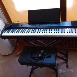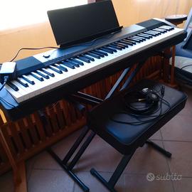 Vendo pianoforte Cadio CDP 130 praticamente nuovo come da foto usato pochissimo con consolle piedistallo pieghevole , seggiolino, cuffie e pedale. CDP-130 è lo strumento ideale per accedere per la prima volta al fantastico mondo dei tasti Il sistema di altoparlanti migliorato produce un suono di pianoforte impressionante, reso ancora più spettacolare dal pulsante effetto auditorium integrato. Grazie ai toni di strumenti a corda migliorati, ogni brano è un'esperienza unica, indimenticabile. Metronomo integrato Pulsante effetto auditorium (basta premere il pulsante per donare al suono della tastiera il reverbero di una sala da concerto) Sistema di altoparlanti migliorato 88 tasti pesati 8 effetti digitali Interfaccia USB Polifonia a 48 voci 5 demo Sistema interno di altoparlanti Supporto CS-44P Pedale sustain Tastiera Tastiera del piano a 88 tasti Risposta al tocco 3 tipi, disattivato Polifonia massima 48 note (24 per determinati timbri) Timbri Timbri incorporati 5: con sovrapposizione Reverbero Da 1 a 10, disattivato Chorus Da 1 a 5, disattivato Brani dimostrativi 5 brani (brani dimostrativi dei toni) Altre funzioni Trasposizione: ±1 ottava (da –12 a +12 semitoni) Intonazione: A4 = da 415,5 a 465,9 Hz (Default iniziale: 440,0 Hz) MIDI Ricevimento multitimbro a 16 canali, standard GM livello 1 Ingressi/Uscite Porta USB: Tipo B Presa jack per il pedale di risonanza: Presa jack standard Presa jack PHONES/OUTPUT: Presa jack stereo standard Impedenza di uscita: 3 Ω, tensione di uscita: 1,5 V (RMS) massimo Presa di alimentazione 12 V CC Alimentazione Trasformatore: CA AD-A12150LW Spegnimento automatico:
