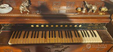 armonium fine ‘800, a serbatoio d’ aria, con una sola tastiera e due pedali per azionare i mantici che fanno vibrare le ance. In ottime condizioni di stato ( da accordare ), con alzata comprendente leggio, vano porta-spartiti sormontato da una specchiera con vetro molato d’ epoca con, ai suoi due lati, mensola e nicchia porta vaso o porta statuetta. Il tutto sormontato in alto da imperiale con balaustra a colonnine. Ad ogni lato della tastiera, un piano tondo porta lume a olio o porta candelabro.