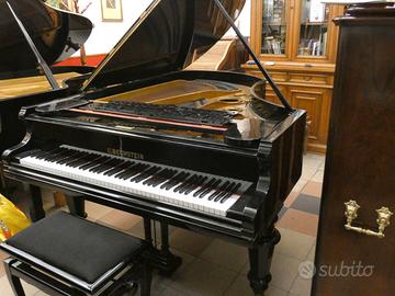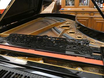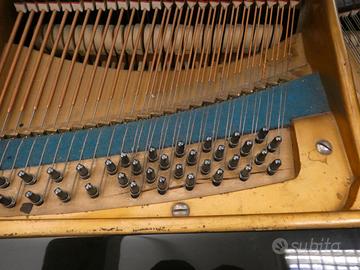 Questo esemplare è stato fabbricato nel 1903 ed ha beneficiato di un radicale restauro alcuni anni fa. Infatti era stata completamente revisionata la meccanica con sostituzione di martelletti e smorze nonchè di feltri e pelli. Inoltre era stata riparata la tavola armonica che presentava alcune crepe ed erano state sostituite le caviglie. Anche il mobile era stato completamente riverniciato. Il risultato è soddisfacente sviluppando una sonorità potente su tutto l’arco della tastiera. Tiene benissimo l’accordatura ma,purtroppo, recentemente si sono aperte alcune crepe nel somiere nella regione dei bassi (come si vede dalla foto) e bisognerà pensare che,o prima o dopo,il somiere andrà sostituito con una spesa quantificabile i 6/7000 euro. Per questo motivo il prezzo attuale è così basso.