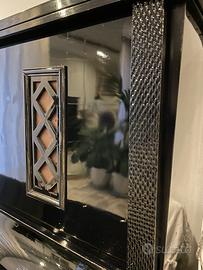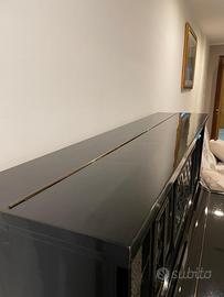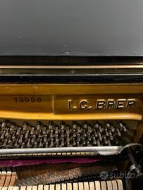 Pianoforte verticale laccato nero con sgabello girevole.
