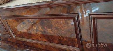 Estetica Unica: Mobile in pregiata radica di noce con splendidi intarsi floreali fatti a mano. La linea classica è testimoniata dai segni storici dei candelabri originali (rimossi per pulizia estetica), dettaglio che ne certifica l'autenticità e l'epoca.