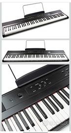 Pianoforte digitale RockJam 88 tasti con 88 chiavi a grandezza naturale, con 10 voci come chitarra, basso, pianoforte verticale, percussioni, organo e altre. Casse da 24 watt incluse. Input per cuffie e input per USB. Nuovo ancora nella sua confezione originale. Ottimo per studenti che vogliono iniziare a suonare il pianoforte.