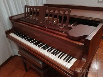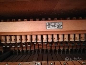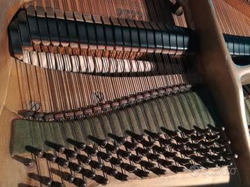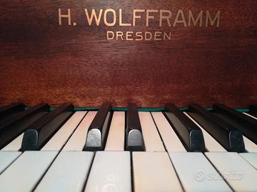 Pianoforte mezza coda marca H. WOLFFRAMM DRESDEN inizi novecento ottima tavola armonica timbro profondo, suono dolce, meccanica J. KELLER & Co. STUTTGART ricercata da collezionisti e musicisti. Tastiera in avorio, martelletti, smorzatori e meccanismo di scappamento revisionati e restaurati, pedale di risonanza e pedale una corda. Struttura in legno d’epoca con doppia gamba.