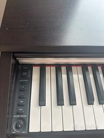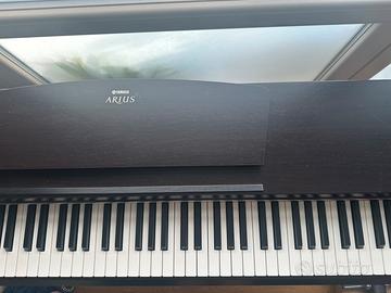 Pianoforte nero Yamaha Arius YDP-135 in ottime condizioni, 88 tasti, 3 pedali, con leggio, incluso di metronomo da 0 a 9 battiti, tempo da 20 - 255 beat e possibilità di registrazione, con effetti digitali e canzoni, tasti in ebano e avorio sintetico, incluso di panchetto in pelle marrone regolabile.
