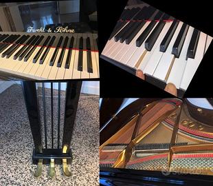 Pianoforte ¼ di coda (1,43 cm x 1,43 cm), tre pedali, marca Furcht & Shöne, acquistato fine 2006. Come nuovo, unico proprietario, suonato pochissimo, accordato ogni anno. Provvisto di sotto ruote in plastica per proteggere parquet o pavimenti delicati e copertura su misura in velluto verde smeraldo. Eventualmente, vendo anche panchetta professionale da concerto di costruzione artigianale (C.G.M. di Mariano Comense). Super imbottita, pelle nera opaca capitonné e struttura laccata nera come pianoforte. Ottimo stato. Per vederlo e provarlo, o per altre informazioni, contattatemi. Il pianoforte si trova a Sarnico BG.