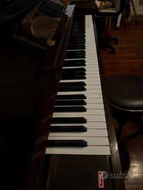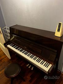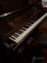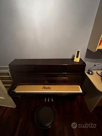 Pianoforte a parete in legno massello Rösler, completo di sgabello imbottito originale regolabile in legno, copritastiera originale in velcro con logo in evidenza. In omaggio includo metronomo manuale vintage Nikko.