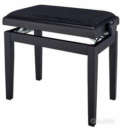Supporto in legno, pedaliera e panca in legno con seduta rivestita in velluto nero.