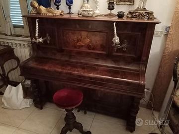 Bel pianoforte tedesco Wittig di Berlino in radica di noce fine 800 con leggio, sgabello, candelabri in bronzo, funzionante ma da accordare