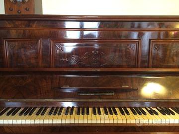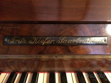 Splendido pianoforte intagliato in radica di noce biondo, due pedali, telaio in ghisa, fori frontali porta-candelabri non presenti già al momento dell'acquisto in Salento nel 1976.Meccanica funzionante da ricalibrare.Tastiera in avorio. Risale agli ultimi anni del 1800- primi '900 (Fritz Kiefer venditore- costruttore pianoforti in Saarbrücken, Germania).Buono, usato, ben conservato, tenuto con cura. Vendo per mancanza di spazio avendo in casa anche un pianoforte a coda (190 cm) e un altro pianoforte verticale. Si trova al 2° piano, ritiro carico dell'acquirente.Regalo elegante sgabello in noce, risalente alla fine dell'800.