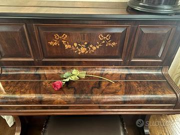 Il pianoforte presenta un mobile in legno massello con eleganti intarsi decorativi, in condizioni estetiche eccellenti, senza graffi o danni evidenti. Esternamente è perfettamente restaurato e conservato.