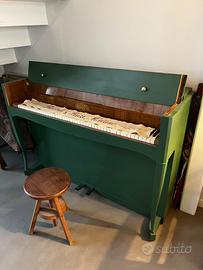 Pianoforte verticale ERARD Paris, precedentemente restaurato e successivamente rivisitato con una finitura verde opaco che lo rende un pezzo unico e di forte carattere. Conserva raffinati dettagli originali in legno a vista, che dialogano bene con il colore e ne esaltano l’estetica vintage.