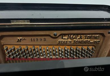Vendesi pianoforte verticale "G. Mola – Torino" risalente alla fine dell'Ottocento (circa 1885-1895), Matricola 11293, dimensioni 148x125x62 cm (lxhxp), mobile elegante con finiture d'epoca, colore nero lucido, tasti bianchi in avorio naturale/neri in ebano, meccanica originale completa e funzionante, tavola armonica in abete con piastra in ghisa, due pedali in ottone (risonanza e smorzatore).