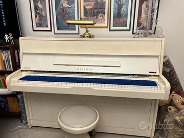 Vendo pianoforte verticale Melford, elegante color avorio, adatto sia a studenti che a musicisti amatoriali. Lo strumento è stato sempre tenuto in ambiente domestico e si presenta in ottime condizioni sia estetiche che funzionali. Include copritastiera blu e sgabello originale coordinato. Particolarmente indicato per chi cerca uno strumento affidabile e dal design raffinato.