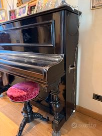 Pianoforte verticale dei primi del ‘900 in legno ebanizzato con tasti in avorio e due pedali.
