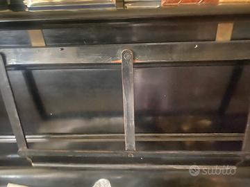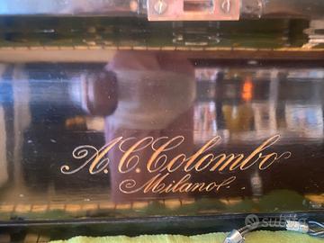 Pianoforte verticale con sgabello. Marca A. C. Colombo. Da accordare . Copri tasti originale dell’epoca . Sgabello con seduta staccata dalle gambe .