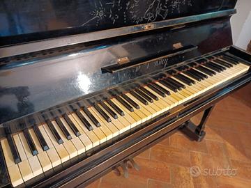 pianoforte di colore nero con intarsi che formano decori sulla parte alta e la parte bassa dello stesso Il pianoforte è da ristrutturare, e da accordare ma non manca di nulla. È funzionante