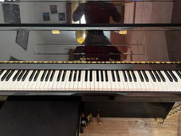 Vendo per trasferimento ad Avezzano splendido pianoforte verticale Sammik mod. Imperial (German Scale), finitura nero lucido. Lo strumento è stato utilizzato da una musicista professionista ed è in ottime condizioni sia estetiche che meccaniche. - Meccanica: martelliera in ottimo stato, non usurata. - Suono: timbrica profonda e brillante, tipica della scala tedesca Sammik. - Manutenzione: regolarmente accordato e curato. - Posizione: Roma, zona Piazza delle Gardenie (adiacente Metro C). - Piano: 6• piano con ascensore (NB lo strumento non entra in ascensore, richiede trasporto a spalla o con autoscala). Il prezzo è già ribassato per agevolare l’acquirente nelle spese di trasporto specialistico dal piano. Disponibile per qualsiasi prova acustica e tecnica.