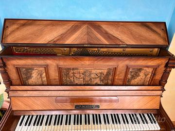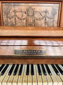 🎹 pianofote verticale schiller da accordare dei primi ‘900 con seduta restaurata foderata. 🚛 trasporto a carico dell’acquirente. ⏱️ usurato dai segni del tempo. 📐 148x68 cm, altezza 128 cm