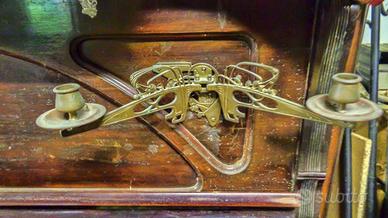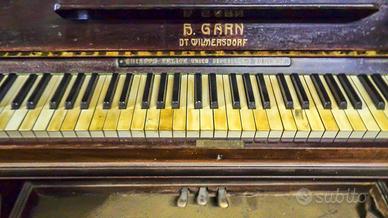 Pianoforte a muro - verticale d'epoca - Pianoforte B. Garn – DT Wilmersdorf - a tre pedali e con due candelieri da restaurare vendo per liberare spazio. In particolare questo pianoforte era stato negoziato a suo tempo dal depositario Felice Chiappo di Torino (che risulta attiva dal 1851) come da targa riportata. Come da foto si vedono i due candelieri laterali e la lavorazione del legno in stile liberty. Utilizzabile come elemento decorativo o da restaurare.