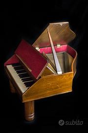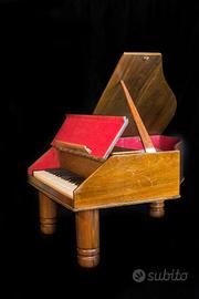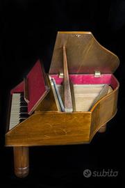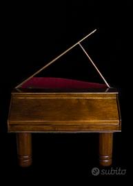 Piccolo clavicembalo fine anni 60 impiallacciato noce con tre gambe in teak tornite.Perfettamente funzionante.Tre ottave+3 tasti fino al mi.