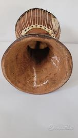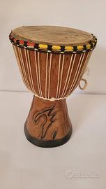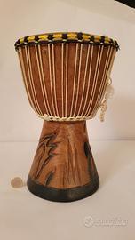 Piccolo djembe realizzato a mano in Cameroun, in legno pesante intagliato.