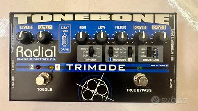 Vendo Radial Tonebone Trimode, preamp/distorsore valvolare per chitarra in ottime condizioni e perfettamente funzionante. Pedale di altissima qualità, costruzione solida in metallo, ideale sia per live che per studio. Grazie alla valvola 12AX7 integrata offre un suono caldo e dinamico.