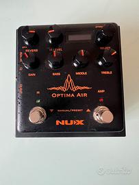 NUX Optima Air è un simulatore di chitarra acustica con preamp ottimizzato per elettrica e acustica: scegli il profilo di chitarra acustica che vuoi simulare e Optima Air penserà al resto in base al tuo pick up. Dotato di IR loader con 15 simulazioni di cassa, profilatore IR, Gain, EQ 3 bande e riverbero integrato, dispone di connessioni cuffia, Aux e FX loop e DI Out.