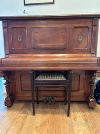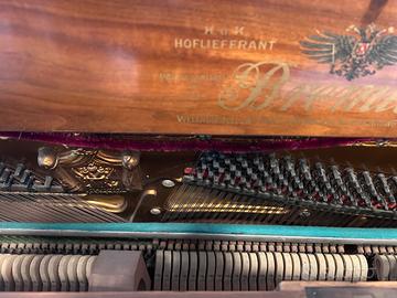 Vendesi raffinato pianoforte verticale d'epoca marca Brenitz, eccellente esempio di artigianato mitteleuropeo. Il mobile è realizzato in legno pregiato con splendide venature a vista e fregi decorativi intagliati a mano che ne esaltano l'eleganza.