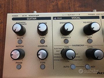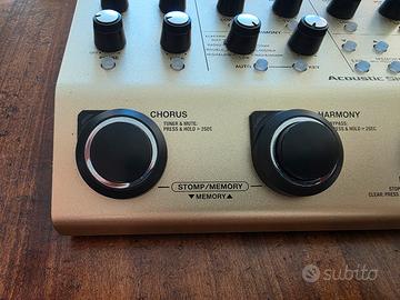 PROCESSORE DI EFFETTI PER VOCE E CHITARRA ACUSTICA Tra i cantanti & cantautori che suonano la chitarra acustica la competizione è davvero agguerrita. Il VE-8 Acoustic Singer offre tutti gli extra che servono a metterti in risalto e a farti brillare, grazie al sound professionale BOSS, in ogni vostra performance. Facile da usare, il VE-8 offre effetti di qualità da studio per voce e chitarra, oltre a straordinarie armonie e loop in tempo reale, il tutto in un formato compatto, che ti accompagnerà ovunque. Con un suono di qualità superiore e potenti funzioni creative al vostro comando, i vostri fan impazziranno ovunque suoniate. Caratteristiche principali Un'unica soluzione compatta per preampli ed effetti, pensata per il cantante che suona la chitarra acustica Create e impostate i ricchi e sofisticati effetti BOSS usando controlli semplici quanto intuitivi Elaborazione vocale in qualità da studio con 4 tipi di effetti di ambienza, oltre ad Enhancer, correzione cromatica dell'intonazione e molto altro ancora Crea armonie vocali dal suono naturalissimo in tempo reale, basate sull'esecuzione alla chitarra o impostando manualmente la tonalità Include un effetto di raddoppio della voce, oltre ad elaborazioni come voci elettroniche "hard-tuned", distorsori e un effetto di voce radiofonica Il canale dedicato alla chitarra include acoustic resonance, riverbero, chorus, accordatore e vari effetti, oltre a un invertitore di fase e un filtro notch La funzione looper con 80 secondi di registrazione e la possibilità di creare loop di chitarra e voce indipendenti La modalità Memory permette di salvare e richiamare 50 delle vostre impostazioni preferite Connessioni flessibili per integrarsi al PA principale e ai monitor sul palco, oltre all'USB per registrare sul computer Funziona con sei batterie AA o con l'alimentatore incluso Dimensioni: 217 x 65 x 161 mm Peso: 1,3kg