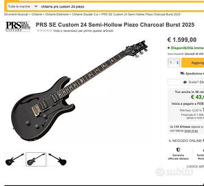 VENDO COME USCITA DA NEGOZIO, in quanto utilizzata un paio di volte in studio. Tasti perfetti. REGALO 2 SET CORDE PRS. Riprende le caratteristiche della Custom 24 originale in versione Semi-Hollow, aggiungendo una risonanza naturale e un suono vibrante. Il piezo LR Baggs/PRS aumenta la versatilità di questo strumento offrendo sonorità elettriche e acustiche in un'unica chitarra. Colorazione Charcoal Burst.Gli humbucker sono gli 85/15 "S" che, con il tono push/pull permettono di ottenere ancora più sonorità. Il sistema LR Baggs/PRS auementa la versatilità di questa chitarra, permettendo di ottenere sonorità acustiche oltre alle tradizionali elettriche. I due controlli del volume (piezo e pickup magnetici) e i due jack di uscita (mix/piezo e magnetici), permettono di gestire i due segnali in base alle esigenze. Collegando la chitarra all'uscita "Mix/Piezo", i due volumi permettono di miscelare il segnale del piezo con quello dei pickup. In alternativa, è possibile collegare i due jack separatamente e mandare il segnale del piezo ad un amplificatore per acustica o a una DI e direttamente all'impianto. Utilizzando il jack dedicato ai pickup magnetici, la batteria del piezo viene completamente bypassata, salvaguardandone la durata (in questo caso, i pickup magnetici sono operativi anche nel caso in cui la batteria del piezo fosse completamente scarica). Costruzione Corpo: Semi-Hollow con F-Hole singolo (acero fiammato e mogano) Numero di tasti: 24 Scala: 25" (635 mm) Legno Manico: Acero Truss Rod: PRS Double-Acting Forma Manico: Wide Thin Spessore Manico al capotasto: 20.64 mm Spessore Manico al 12esimo tasto: 22.6 mm Larghezza Manico al capotasto: 42.85 mm egno Tastiera: Palissandro Radius Tastiera: 10" (254 mm) Pickup al ponte: 85/15 "S" Pickup al manico: 85/15 "S" Controlli: Volume Piezo, Volume Magnetico, Tono Push/Pull con Blade Switch a 3 vie Corde: PRS Classic 10-46 Custodia: Gig Bag PREFERIBILMENTE ZONA ROMA CON CONSEGNA A MANO. NON SCAMBIO.
