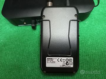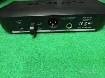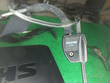 Radiomicrofono Shure con archetto WH20 con trasmettitore Shure BLX1 e ricevitore Shure BLX4 M17. Questo Radiomicrofono può essere utilizzato anche con chitarre e basso con i cavi inclusi. Presso leggermente trattabile.