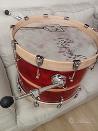 Batteria artigianale unica, interamente realizzata in acero marezzato con sistema a doghe orizzontale, esaltando le basse frequenze.