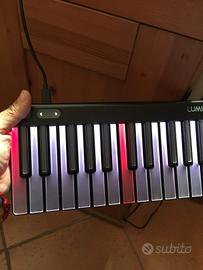 NUOVA, PERFETTA. MAI USATA - Venduta nella sua confezione ORIGINALE. No perditempo e non OFFERTE RIDICOLE. no scambi LUMI TASTIERA MIDI 24 TASTI LED RGB 24 Tasti LED RGB retroilluminati, espandibile a 2,3,4 ottave 100 suoni MPE con IL software ROLI Studio Contenuto della confezione: Tastiera Lumi, cavo USB C - USB B,. AGGIUNGO porta tastiera artigianale nera.