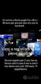 Sala prove e studio di registrazione, possibilità di registrare le proprie prove in multitraccia, cabina insonorizzata batteria con preascolto in spia o cuffia. A disposizione piano digitale batteria completa di piatti due ampli chitarra e un ampli basso. Due ore 50 euro - se si prende un pacchetto mensile di 4 prove da 2 ore cadauna 80 euro anticipati alla prima prova. La registrazione delle singole tracce è gratuita, il mastering e l'editing avranno un prezzo a parte da concordare.