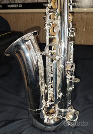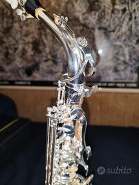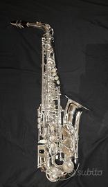 Bellissimo Sax Alto Cinese , replica di una nota marca di Taiwan. Intonato , bel suono, meccanica perfetta. solo provato , quindi pari al nuovo. Argentatura spettacolare. Competo di custodia, becco e collarino.