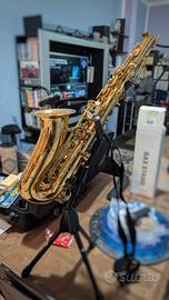 Compresi nel prezzo vari accessori: sax stand, cinghia, manuale per principianti e 3 confezioni di ance + borsa originale (ma con cerniera rotta, da sostituire).