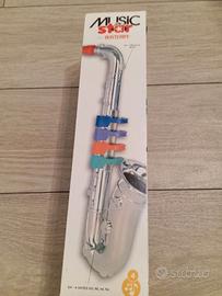 Sassofono giocattolo Bontempi 4 note DO, RE, MI, FA, note colorate Corpo metallizzato Mai usato, ancora nella scatola originale Made in Italy