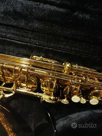 Sassofono tenore tenuto bene, completo di custodia rigida e vari accessori.